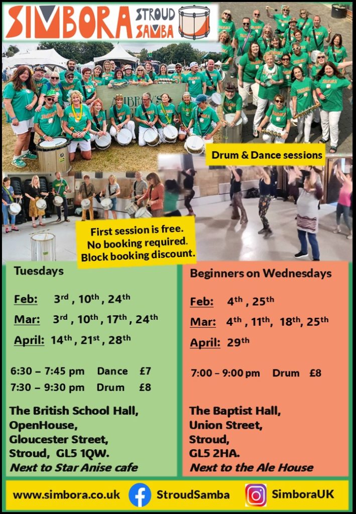 Wednesday night sessions at Stroud Baptist Hall, Union Street, Stroud GL5 2 HA, next to The Ale House. Google maps. There’s also a dance class and main band rehearsal on Tuesdays.